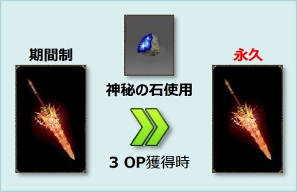 さらに,マスタリー装備のオプションを変更することができるアイテム「神秘の石」を使用し,3オプションを付与することができれば,使用した武器が「期間制」から「永久」に変換され,持続的に使用する事ができるようになります。