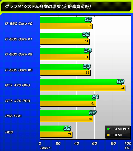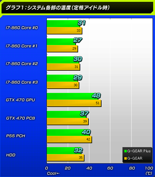 外気を効率的に送っているGPUと,直線的なエアフロー上に置かれているHDDとで,G-GEAR Plusの温度が下がっている点は要注目。G-GEAR Plusの設計は正しい方向を向いているといえるだろう。