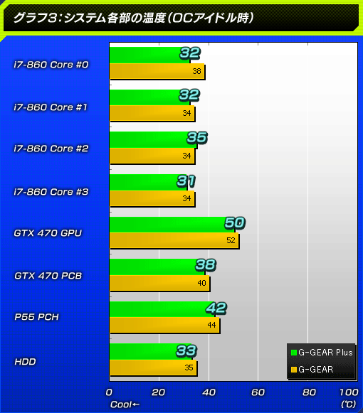 ……というわけで,さっそく定格動作時の温度からチェックしていこう。グラフ1はアイドル状態において,G-GEAR PlusとG-GEARの温度を比較したものだが,全体的にG-GEAR Plusのほうが2〜3℃低い傾向を示している。