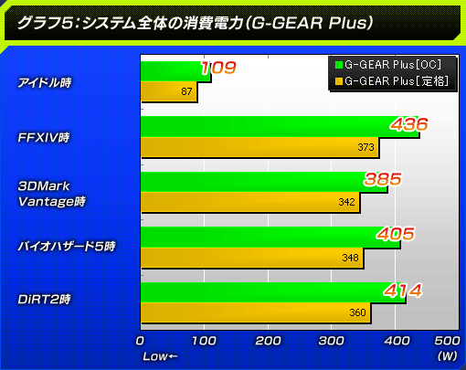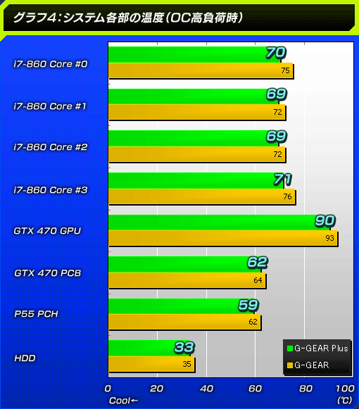 大きな違いが出るのは,オーバークロック設定を行って高負荷状態に置いた場合だ。G-GEAR PlusとG-GEARの温度差は定格動作時より開く傾向にあり,とくにCPUコアは最大5℃の差が付いている。CPUクーラーまでのエアフローがPCケース前面から最短距離で用意されるというエアフローの改善が,GPUだけでなく,CPUの冷却にも一役買っていることが確認できよう。