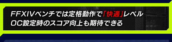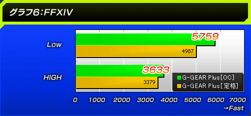FFXIVのスコアをまとめたのがグラフ6。ここではヒューラン(女)を選択しているが,定格動作時のLowで「快適」レベルのスコアを示した。また,オーバークロック設定を行うと,とくにLowのスコアが伸びているのが分かる。5799だと指針は「とても快適」だ。