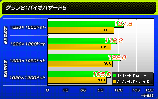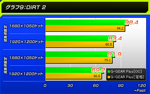 実際のゲームタイトルを用いたバイオハザード5とDiRT 2でも,傾向自体は変わらない(グラフ8,9)。ただ,定格動作でもゲームをプレイするのに申し分のない平均フレームレートが出ていることは押さえておきたい。
