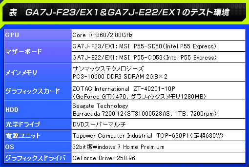 今回4Gamerで入手したGA7J-F23/EX1は,通常モデルである「GA7J-G23/S」をベースに,GPUを,BTO標準構成の「ATI Radeon HD 5870」から,より発熱量の大きな「GeForce GTX 470」へと変更した,テストのための特別仕様だ。G-GEARのラインナップ的に,同GPU搭載モデルは「GA7J-F23/S」となるのだが,今回はGA7J-G23/Sベースにすることで,G-GEAR Plusミドルタワーケースの冷却能力を見ようというわけである。そのため今回は,GA7J-F23/EX1を“GA7J-G23/S相当の製品”として認識してほしいと思う。