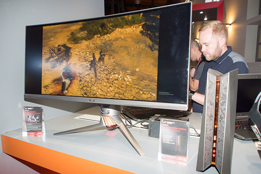 ゲーマー向け液晶ディスプレイの新製品として紹介されたのが,「ROG Swift PG348Q」だ。34インチサイズで解像度3440×1440ドット,アスペクト比21:9の湾曲IPS液晶パネルを採用した製品で,垂直リフレッシュレート100Hzと,NVIDIAのディスプレイ同期技術「G-SYNC」に対応するのが特徴だ。