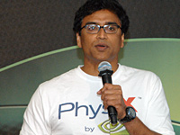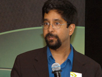「PhysX by NVIDIA」のTシャツを着た,Manju Hedge氏(VP, PhysX Solutions, NVIDIA)。AGEIAのチェアマン兼CEOだった人である