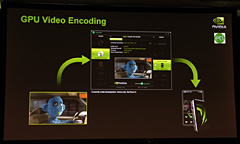ちなみに右のスライドは,NVIDIAが示した実験データ。2時間分の1280×720ドット/30fpsムービーを,さまざまな環境でエンコードしたときの所要時間を示したものだ。ここでもリアルタイムの約4倍速エンコードが達成されたことが示されている。