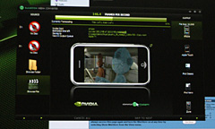 最初のデモは「1280×720ドット/30fpsの高解像度MPEG-2ムービーをiPhone向けのH.264ムービーに変換する」もので,リアルタイム再生の最大5倍速でエンコード可能なさまを見せつけた。見た目に衝撃的だったのはプレビュー画面で,デモでは,エンコード中のフレームをDirectX 10フレームバッファとして出力していたのだが,そのプレビュー画面のフレームレートが150fpsをマークしていたのだ。エンコード中のプレビューといえば,紙芝居状態のコマ送りというのが見慣れた情景だが,今回のデモでは,プレビューも5倍速の早送り状態で,コマ落ちなく表示されていたのである。