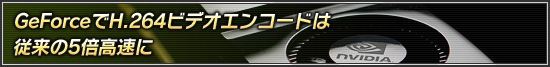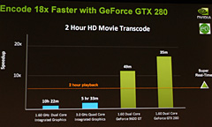GeForce GTX 280を利用すると,Core 2 Quad/3GHzの約10倍高速にエンコード可能とNVIDIAは主張する。GeForce 9600 GTでも,リアルタイム再生の2倍速処理が可能な点に注目