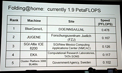 前述したように,GeForce 8以上は世界中に7000万個あるとされ,仮にそれらすべての平均演算能力を100GFLOPSとして単純計算すると,7000PLOPSもの演算能力が世界で眠っていることになる。もちろん,これは捕らぬ狸の何とやらだが,Pande教授は「その0.1%でも参加してくれれば7PFLOPSになる。1%なら70PFLOPSだ」と述べ,Folding@Homeが,CUDA 2.0によって数十PFLOPS時代に突入する近い将来をを予感。また,「今やFLOPS,すなわち浮動小数点演算が無料の時代に来ている。この時代では,現在のアルゴリズムの高速化に満足しているだけではいけない。新しいソフトウェアパラダイムの模索をして,この膨大な計算能力を有効に使うことを考えなければ」と結んでいた。