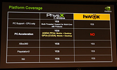 「ハードウェアアクセラレーションに対応する」点で,HavokよりもPhysXが決定的に優れるとNVIDIAは位置づける。HavokとAMD,そしてHavokの背後にいるIntelと,三つ巴の戦いが始まる?