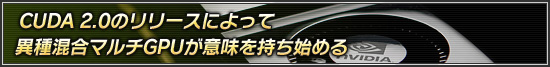 なお,CUDAのマルチGPU対応だが,NVIDIA SLI(以下,SLI)とは異なり,システムからは各GPUが独立した,複数の並列コンピューティングリソースとして見える。そのため,SLIブリッジコネクタは不要で,異なるモデルのGeForceであっても問題がない。ただ――これはエンドユーザーが意識すべき問題ではないが――マルチGPUで“マルチCUDA”を行う場合は,その構成を明確に意識したプログラミングを行う必要がある。