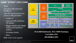 統合されるCPUコアは「Husky」(ハスキー)。現行のPhenom II X4シリーズなどと同じく,「Stars」(もしくはK10)と呼ばれるアーキテクチャ世代のもの。ただし,AMDでエンジニアを務めるMike Goddard氏は,コアあたり容量1MBのL2キャッシュを搭載し,ハードウェアプリフェッチやロード・ストアバッファサイズが強化されているため,従来のStarsコアと比べて,演算能力は約6%向上していると述べる。