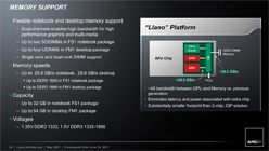 アンコア(Un-core)部では,メモリコントローラが,デュアルチャネルDDR3-1600&DDR3L-1333対応になっている点が特徴として挙げられよう。1.5VではPC3-12800,1.35VではPC3-10600のモジュールに対応できるわけだ。また,デスクトップPC向けA-Seriesの場合,1.5VでDDR3-1866までサポートできるともされているため,より広いグラフィックスメモリバス帯域幅が必要な場合には有効なオプションとなるだろう。