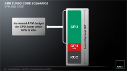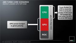 Goddard氏によれば,A-SeriesにおけるTurbo CORE機能は,CPUコアよりもGPUコアクロックの引き上げに比重が置かれており,CPUコアとGPUコアの両方に負荷がかかっているときは,まずGPUコアがあらかじめ設定されている最大TDPまでを利用したうえで,残りを各CPUコアへ分散する仕組みだそうだ。