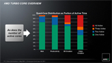 AMDは,A-SeriesにTurbo CORE機能を実装するにあたって,アプリケーションごとのCPU負荷や消費電力特性を解析したという。そのうえで,TDP値に対する余裕分を各CPUコアに振り分けて動作クロックを制御しているとのこと