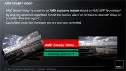なお,UVD 3のの機能は基本的にRadeon HD 6000シリーズがで採用されるものと同等だが,GPUコンピューティング機能を使って,撮影した動画の手ブレを再生時に補正する「AMD Steady Video」(以下,Steady Video)が,新規に追加されているとのこと。なお本機能は,Radeon HD 6000シリーズでも,グラフィックスドライバ「Catalyst」のアップデートによって利用できるようになるとのことだ。
