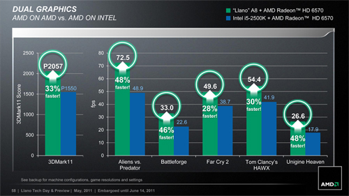 デスクトップ向けA8とRadeon HD 6570とを組み合わせたAMD Dual Graphics構成時のシステムと,「Core i5-2500K/3.3GHz」とRadeon HD 6570とを組み合わせたシステムでの性能比較。AMD Dual Graphicsにより,前者のスコアが大きく伸びる