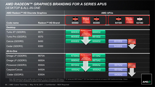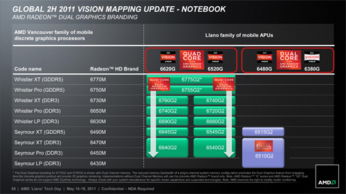 なお,ノートPC向けA-Seriesでは,「Radeon HD 6620G」などといった「G」付きモデルナンバーが統合型GPUに対して与えられるが,AMD Dual Graphicsが有効なシステムにおいては,「G2」などといった形で,「2」付きの,新たなモデルナンバーが与えられる。例えばノートPC向けA8のRadeon HD 6620Gの場合,「Radeon HD 6770M」と組み合わせられたときは「Radeon HD 6775G2」,「Radeon HD 6630M」と組み合わせられたときは「Radeon HD 6690G2」といった具合に,モデルナンバーが引き上げられるのである。