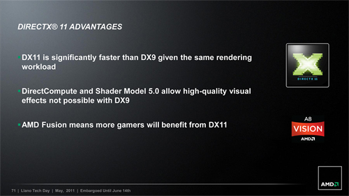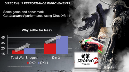 続いて,AMDでソフトウェアデベロッパサポートなどを統括するNeal Robison氏が登壇し,最新ゲームタイトルにおけるDirectX 11対応グラフィックスの重要性について説明。「Shogun 2: Total War」と「DiRT 3」を例に,同氏は,「同じゲームレンダリング処理でも,DirectX 9で動作させるより,Direct 11で動作させたほうがフレームレートが上がる」とアピールした。また,Core i5内蔵グラフィックスとのパフォーマンス差なども公開している。