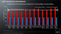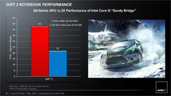 DiRT 3における,ノートPCシステムでのパフォーマンス比較。A8-3510MXと「Core i5-2410M/2.30GHz」とでは大きな差が生まれるとされた