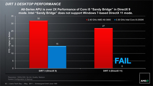 デスクトップ向け「A8-3800/2.40GHz」との「Core i5-2500K/3.3GHz」とでDiRT 3におけるパフォーマンスの比較を行った結果。1920×1200ドットの解像度では,メモリ帯域幅の制約が影響し,より複雑な処理を行うため,DirectX 11のほうがフレームレートは低くなるという