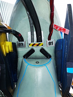 肩の下側はこのようになっている。ケーブルがつながれているのは,メンテナンス中という設定だろうか。ケーブルにも注意書きが入っている