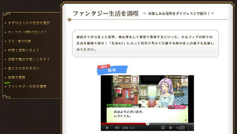 公式サイトのSystemに「ファンタジー生活を満喫」を追加し、主人公が暮らすセルフィアの町での生活を紹介するダイジェスト動画を公開しました。「起床」では朝ベッドから起きて住人へ挨拶をするところまで。「畑仕事1」「畑仕事2」では、外にある畑で作物を育てて出荷するまでの流れ。「食事」では食堂で食事をする住人たちの様子や料理の注文。「依頼」では依頼箱にある依頼を受けてお礼を受け取るまでの流れを紹介しています。