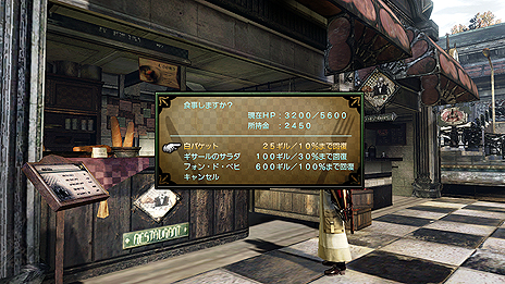 【食べ物】街にはさまざまなフードショップが立ち並んでいる。食事をとることでHPが回復する |