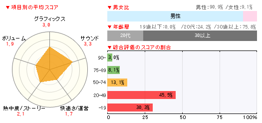 Ť¯¤Ê¤Ã¤Æ¤·¤Þ¤¤¤Þ¤·¤¿¤¬¡¢¤³¤Î¥²¡¼¥à¤Ï¥¿¥¤¥È¥ë¤Ë½ñ¤¤¤¿¤è¤¦¤Ë¥²¡¼¥à¤È¤·¤Æ¤Ï²ÄǽÀ¤Î´¶¤¸¤ë¥²¡¼¥à¤À¤È¤Ï»×¤¤¤Þ¤¹¡£¤·¤«¤·¤Ê¤¬¤é¡¢¥Ð¥é¥ó¥¹¤À¤Ã¤¿¤ê¿§¡¹¤ÊÉôʬ¤¬¤¢¤Þ¤ê¤Ë¤â¤ªÁÆËö¤Ç°¤¤Éôʬ¤¬ÌÜΩ¤Á¤¹¤®¤Æ¤¤¤Þ¤¹¡£Àµ¼°¥µ¡¼¥Ó¥¹¤«¤éȾǯ°Ê¾å·Ð¤Á¤Þ¤·¤¿¤¬¥Ð¥é¥ó¥¹¤äAM´ØÏ¢¤Ë´Ø¤·¤Æ¤Î²þÁ±¤¬°ì¸þ¤Ë¸«¤é¤ì¤Þ¤»¤ó¡£¤Þ¤¿¥²¡¼¥à¤ÎÀ¼Á¾å¡¢½é¿´¼Ô¤ÎÊý¤Ë¤ÏÉߵ郎¹â¤¯½é¿´¼Ô¤ËÂФ¹¤ë¥µ¥Ý¡¼¥È¤âÉÔ½½Ê¬¤Ê¤Î¤Ç¤ª¤¹¤¹¤á¤·¤Å¤é¤¤¥²¡¼¥à¤Ç¤¹¡£¼ç¤Ë°Ê¾å¤ÎÍýͳ¤«¤é¤³¤Î¥²¡¼¥à¤ÎÀè¹Ô¤¤¬É԰¤ǾÍèÀ¤âÁ´¤¯¸«¤¨¤Ê¤¤¤¿¤áɾ²ÁÅÀ¤ÏÄ㤯ÀßÄꤷ¤Æ¤¤¤Þ¤¹¡£ - ¥×¥ì¥¤»þ´Ö