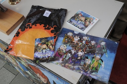 左からC賞の世界樹の迷宮 F.O.E Tシャツ,参加賞のポストカード,D賞の特製A4クリアファイル