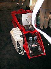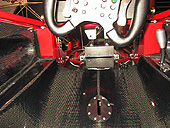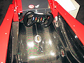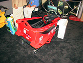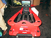 ・F1の筐体でレーシングシムはいかが? いかに本物の雰囲気を味わえるかを追求したくなるレーシングシム好きには垂涎の一品。 トンネル状の先にあるペダル,低い着座位置,肩からしっかりとホールドしてくれるシートなどF1マシンの筐体を再現しており,"デバイスもキチンと(?)のめり込んでいこう!"という気持ちがあれば,ぜひとも欲しくなる。デモ機のハンドルはForce Feedbackではなかったが,適度な重さがあり,手になじむ感触が素晴らしかった。 ハンドル,シフトレバー,ペダルの全てを自社製品で固めたフルカスタム版。もっとも意外だったのが,プレイ時の姿勢が思ったより全然楽なことだった。シートはカーボン製で固く,低く顎を引いた姿勢を強いられて疲れるのかと思ったが,逆に体全体をホールドしてくれるので椅子でプレイするより楽なくらい。お尻の位置が非常に低くなっており,かかとのほうが上に位置して重心が安定する。肩までホールドするシートはF1の雰囲気満点。 ちなみにペダルは垂直に立っている。筐体にしっかり固定出来るのでペダルのバネを強めしても心配ない。これ結構地味ながらも大事な部分。実際に乗り込むときは,ハンドルを一度上方向に上げてから滑り込む。ペダルは前後に幅広く位置が可能,その後にハンドルの高さを調整する。 デモプレイはF1RCだった。畳二畳分の置き場所(収納時はペダル部が外れるので大きさは半分になる)があって,最も安価なキットで795ドル+輸送費。これを出せる人にはぜひともお勧めしたい。筆者は無理そうだ……。ちなみに会社のサイトは「こちら」。