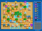 韓国PCゲーム事情#1 Text by Kim Dong Wook特派員 韓国のオンラインゲーム界は今,"爆弾"の嵐が吹き荒れている。その"爆弾"とは,日本のハドソン社の「ボンバーマン」みたいなゲーム達のことだ。 現在韓国でサービスインしている"爆弾ゲーム"は3種類。 トップを突っ走るのはMPLAY社の「BnB」だが,同時接続者がなんと33万人を越えているモンスターぶり。BnBは,画面を見れば分かるように(画面右)基本的には「ボンバーマン」タイプ。しかし韓国伝統ともいえる遊び方の"EOL UM DDANG"(敢えて読むなら"オルムテングー" 最大4人vs.4人で遊べる,韓国の鬼ごっこのような遊び)方式を採用しており,チーム内でお互い助け合えるようになっている。 2位はAOZORA社のShake2(画面真ん中)で,システム的な面から見てもグラフィックスを見ても「ボンバーマン」そのものといってもいいかもしれない。Shake2は2001年12月からサービスインしており,同時接続者数は1万2000人,会員数は約100万人。 3位が,この手の元祖ともいえる「Bomber Man Online」(画面左)で,韓国のWizgate社が日本のハドソン社とのライセンス契約を結んで制作したゲームだ。24種類のキャラクターと15個のマップからなるBomber Man Onlineには,オリジナル作品にはなかった新しいルールも追加されている。 しかしBomber Man Onlineを除いた2作は,オリジナルの「ボンバーマン」の著作件を侵害したとしてクレームを受けており,両社の関係者はそれを否定している状態だ。 とはいえ,これから韓国の"オンライン爆弾ゲーム達"は,従来のアクションゲームのキングともいえる「ポトリス2」のポジションを大きく脅かしている。今後の動向から目を離せない注目株だといえるだろう。 ・BnB公式サイトは「こちら」 ・Shake2公式サイトは「こちら」 ・Bomber Man Online公式サイトは「こちら」