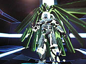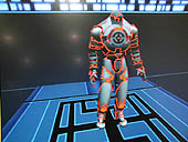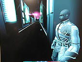 NVIDIA社のブースでは,なぜか同社のTシャツを着たモデル二人の写真撮影会を行っていたが,それでも今回のECTSでは一番派手な展示だったかもしれない。そんな彼女らの華やかさに隠れるように,E3ではムービーだけが紹介されていたMonolith社制作/Disney Interactive社販売のFPS「Tron 2.0」のプレイアブルデモがあったのでプレイしてみた。 用意されていたのは,実際に敵と戦えるECTS用デモと,まだ作りかけのマップが二つ,そしてZOOと題されたキャラクターモデルのマネキンの紹介用マップの計四つのみ。1970年代にディズニーによって制作された「Tron」はCGを利用したSF映画の草分けで,人間がコンピュータの中に取り込まれてゲーム(?)で対戦するというストーリーだった。その後アーケードゲームなどでゲーム化されたこともあったが,Tron 2.0はそのまま映画の続編という位置付けになる。 今となっては古臭い3D表現で,緑色のグリッドラインの上をネオンがかった乗り物が激走するシーンを覚えている読者もいるだろうが,Tron 2.0にはその雰囲気が色濃く残っており,テクスチャの貼られていないオブジェクトが存在するのが最近のゲームとしては逆に目新しい。戦闘デモは,赤いボールを投げてくる敵に対して青いフリスビーのような円盤を投げて破壊するというもので,どんな武器でも壁に当たればブーメランのように跳ね返ってくるのだけど,ミスするとはるか後方の壁にまで飛んでいってしまい,10秒以上攻撃できなくなるようなこともある。背景やタイミングを間違えないように的確に敵を狙わなければならないようだった。 ZOOマップに展示されていたキャラクターモデルは,ゲーム登場するものの一部である7体のみだったが,ほとんどのものが人間に近い形だった。LithTech社の誇るジュピター開発システムで制作されており,Tron 2.0はこの開発キットで作られる初めてのゲームになる予定だったらしいものの,見た感じの状況ではβ段階にはまだまだという印象を受けた。(Okutani)