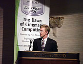 NVIDIA 新世代GeForce FX発表〜新GeForceは, 元3dfxスタッフとNVIDIAスタッフとの共同プロジェクトだった ■新GeForceはVoodooの遺伝子を受け継いだ 12月6日(金),NVIDIAは東京都内のホテルでGeForce FXの日本国内向けの発表会を行った。GeForce FXは,すでにアメリカ ラスベガスで開催されたCOMDEX FALL2002にて発表されたものだが,日本国内では初お披露目となる。 まず驚かされたのは,GeForce FXの開発は,NVIDIAのスタッフとVoodooシリーズで名を馳せたゲーム向けPC用3Dグラフィックスカードメーカー3dfx社のスタッフとの共同で執り行われたという事実だ。3dfx社は2000年12月にNVIDIAに買収されているが,NVIDIAに吸収された後,具体的に「3dfxのスタッフが開発に参加したプロダクト」と公言されたのはこのGeForce FXが初めてだ。 さて,名称がGeForce5ではなくてGeForceFXとなっているのにはいくつか理由がある。 一つは,コアアーキテクチャがGeForce3/4TiのnFiniteFX系エンジンから決別を図り,新コアアーキテクチャCineFXエンジンを搭載したことによる。CineFXエンジンのCineとはCinemaのCineで,これは「映画品質の3Dグラフィックスをリアルタイムで」のメッセージが込められたキーワードだ。 そしてもう一つの理由は,前述の通り,3d"fx"社のテクノロジーが活用されているためだ。 新GeForceはVoodooの遺伝子を受け継いだGeForceといってもいいかもしれない。 ■コアクロック500MHz! メモリクロック1GHz! 総トランジスタ数はRADEON9700を上回る1億2500万個で,TMSCの0.13μmの銅配線プロセスにて製造される。RADEON9700は0.15μmプロセスルールだったこともあり,動作クロックについてはRADEON8500からあまり上がらなかったが,GeForceFXは,コンシューマ向けGPUでは最高クロックとなる500MHz駆動を実現した。 コアクロックがここまで高いと,組み合わせるビデオメモリの選択も厳しくなるわけだが,これは大胆にもDDRII SDRAMを採用する。DDRIIは,クロックをそのままにデータフェッチ量を従来のDDRの二倍に高めることで,実質的に同クロックの動作のDDR SDRAMの2倍のバンド幅に高めた新世代メモリだ。気になるメモリ動作クロックは1GHzで,これまた歴代のGPUと組み合わせるビデオメモリとしては最高クロック値をマークしたことになる(実際にメモリチップの駆動クロックは250MHz。DDRII動作で1GHz相当)。 ただしビデオメモリのバス幅は128ビットで,RADEON9700の256ビットと比べると半分ということになる。 ■パフォーマンスはGeForce4Ti4600の2倍から3倍 GeForceFXについての詳しいアーキテクチャ面の話と,プログラマブルシェーダー周りの仕様については「こちら」を参照してもらうとして,ここでは性能面について見ていくことにしたい。 発表会のプレゼンテーションでは,NVIDIA側で行った各種評価テストの結果が示された。下の画面の真ん中上2枚に注目してほしい。 2048×1536ドット解像度下のにおけるQuake3のフレームレートはGeForce4 Ti4600の約二倍,3DMark2001SEのピクセルシェーダテストに至っては2.5倍のパフォーマンスを示したとのことだ。 ゲームユーザーとして気になるのは,このグラフにさりげなく書いてあるDOOMIIIのパフォーマンスだろう。DOOMIIIのベンチマークテストは一般リリースされていないが,NVIDIAとATIは両社ともにid Softwareに技術者を送り込んでDOOMIIIエンジンの開発に参加させているので,データには信憑性がある。このデータによれば,DOOMIIIもGeForceFXでGeForce4 Ti4600の2.5倍高速に動作することを示している。DOOMIIIがGeForce4 Ti4600で快適に動作しなかった場合には,注目作だけにGeForce FXのキラータイトルになる可能性はある。 ■GeForce FXは2スロット専有する GeForceファミリーは,高性能ではあったが「速かろう熱かろう」というスタンスでパフォーマンス重視で製品を設計してきた経緯があるが,GeForce FXではこの考えを改め,「静音」と「省電力」というフィーチャーを意識しだしたようだ。 GeForce FXはGPUパイプラインの負荷に合わせ動的にファンや電源を制御する。例えば,通常のWindowsオペレーションでは3Dグラフィックエンジンは活用されない。そういうケースではそこへの電源供給をカットして電力消費を抑えるわけだ。また,効率よく,しかも静かにGeForce FXチップを冷却するためにファンはケースに覆われ,ブラケット側に排気するような機構になっているのがユニークだ。 なお,GeForceFXのこの熱管理,電源管理システムを総じて「FXFlow」と呼んでいる。かつて「GeForce2 Go」発表時に「PowerMizer」という熱電源管理技術を発表したが,FXFlowはその発展版ということになるだろう。 ところで,このFXFlowクーリングシステムは背が高く,AGPスロット直下のPCIスロットに干渉してしまう。よってAGPスロットの隣のPCIスロットは事実上利用できないことになる。今回公開された,「実際に動作する」GeForceFXカードを見てみてほしい(下の画面左上)。見ての通りクーラーのカバー部分が第二のブラケットに接続されているので,事実上2スロット使うビデオカードということになる。このあたりの無骨な設計はなんとなく3dfxっぽくないだろうか? ちなみに撮影直前まで実際に