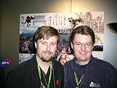 後者はさらにタイトルごとに小さい部屋に分かれていて,そこを見る限りはPCタイトルは2作品。「Microsoft Dungeon Siege II」と「Microsoft Zoo Tycoon 2」である。どちらも世界的なビッグタイトルであり,「さて気合を入れて取材しよう」と思っていると,これらの部屋とは明確に区別された,特殊な部屋に案内された。そこに展示されていたのは,なんとこれまで数点のアートワークしか公開されていなかった「Vanguard:Saga of Heroes」(以下,Vanguard)だったのだ。 先に簡単にVanguardについておさらいしておこう。本作は,人気MMORPG「EverQuest」の開発に携わったBrad McQuaid氏(右の写真の左側)とJeff Butler氏(右の写真の右側)の二人が設立した,Sigil Games Online, Inc.が開発中のMMORPGだ。 これまで正式なリリースは一度出たきりで(「こちら」参照),ほとんど情報はないものの,開発スタッフ達による「第3世代MMORPG」(ちなみにまだオープンβテストすら始まっていない「EverQuest2」や「World of Warcraft」まで第2世代にカテゴリされている)とか,「ナンバー1になることしか考えていない」などの強気な発言の数々も話題となり,かなり注目されているタイトルだ。 さて本作が展示されている部屋に入ると,そこで待っていたのは,くだんのMcQuaid氏およびButler氏。またもや,McQuaid氏の「Vanguardは,次世代のMMORPGなんだよ」という発言から始まった。なお撮影は一切不可だったので,その中で十数分に渡って聞けた話を,極力文章化してみよう。 用意されていたのは,4台のPC。そのうち3台でVanguardが起動されていて,それぞれダンジョン内,街,草原のシーンにセッティングされていた。 残りの1台(ノートPC)には,どうやら全体マップらしきものが表示されている。これを見る限り,どうやら一つの大きな島が舞台になるようだ。この地図には目算したところ8×14程度の升目が書かれていたのだが,この一つの升目が2km四方の広さというから,かなりの広さを有しているのは間違いない。 さて実際に本作が稼働している3台の画面を見てみると,驚くほどではないものの,確かに独特の色合いが魅力的なのが分かる。「この3か所はすべてアーリーステージで,複雑にたくさんの建物があるわけではなく,比較的シンプルな作りになっている」とのことだが,それでも十分現実味のある,あまりゲームっぽくない町並みだ。なんでも,本作に登場するすべての建物は,中までしっかりと設計されており,当然すべて入ることができる。またテクスチャが細かいのも特徴で,どれだけズームしても,その材質を感じさせていた。 ちょっと驚いたのが,煉瓦の壁。煉瓦なのに繰り返しのパターンではなく,実によく"質感"を感じさせてくれた。 ここでMcQuaid氏が繰り返し述べていたのが,その色彩の繊細さだ。可能な限り実世界の色彩を再現しているというのだ。また本作のアートワーク(画像下段左参照)を公表したとき,この世界観を「実現できるわけがない」といわれたそうだが,「あの世界,あの雰囲気ををそのまま,完全に再現できる」と息巻いていた。 ちなみにグラフィックスエンジンは,さまざまなバージョンのUnrealエンジンを組み合わせ,さらにたっぷりとモディファイしたものを使用しているとのこと。なんでもエンジンのチューンに18か月も費やしたとのことで,重力感や空間の広がりの表現力がグッと増している(実際,α版でもある程度実感できた)。 また魚を追いかけて捕まえたり,建物からジャンプオフできたり……という行動の自由さも,このエンジンのおかげだろう。 さて街の画面を見ると,……NPCが空を飛んでいる。ちなみにこの街は,見た感じ中世ヨーロッパ風なのだが,Butler氏によると,「"この街は"中世ヨーロッパ風」。ほかにもいろいろな景色を見られるのだろうか。 ここでちょっと気になったのが,Butler氏の「クエストを解くと,こういうところに行けるようになる」「ここは実際に行ける世界」という言葉。具体的にはどういうことを指すのだろうか? ダンジョンの画面を見ると,キャラクターの大きさから考えて,非常に天井が高いのが分かった。モンスターとの戦闘も見せてもらったが,これまた巨大なモンスターと二人のキャラクターが戦っているのだが,実にスムースな動きを見せていた。 ちなみにこの手のダンジョンにはエレベータのようなものがあり,一方の箱に荷物を積むことで,もう一方に乗っているキャラクターを情報に運ぶ,なんてこともできるようである。 さて話は変わって,乗り物について。馬や船に乗れるとのことだった。また船に乗って積み荷をあちこちに運ぶことで,交易も可能とのこと。"交易ばかり"というプレイスタイルも大いにアリというから,面白い。 そのほかに覚えていることを列挙しておこう。各キャラクターは各種スキルを覚えることができ,スキルレベルはマックスで40。どうやら,一つのキャラクターで,すべてのスキルを40にすることも不可能ではないようだ。 各種クラフトは,"クラフター"が行うことができる。このクラフターというのはクラスのようなもので,キャラクターメイキング
