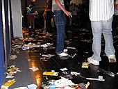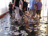 <会場で見たドイツの不思議> ●フロアはゴミだらけ いらないパンフや雑誌折り込みのハガキはすぐに捨て,やがて紙吹雪のように散乱する。タバコだってポイ捨てなので引火しないか気がかりだ。会場のフロアは午後になる前にゴミで溢れかえり,まるで暴動のあったサッカー会場のようになる