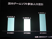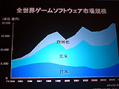 それは,ここ10年で世界のゲーム市場は3倍に膨れ上がったが,日本のゲーム市場が3倍に到達していなく,そこだけを見た場合は確かに日本市場は落ち込んでいるが,それはあくまでも比較論に過ぎず,実際は着実な伸びを見せているというもの。また,グラフィックスが2Dから3Dへの遷移などでコンテンツも変化したこと,デジタル販売という新形態が市場を大きく変えたファクターとなったことから,今後の10年で,ゲーム市場はスタンドアロンからネットワーク(すべてではない)へと確実に移り変わり,ユーザー間のコミュニケーションが重要になってくると述べた。そして,そのネットワークゲームへ同社が取り組んでいる一例としてファイナルファンタジーXIを出し,先日稼動を開始した拡張パック「プロマシアの呪縛」と欧州でのサービス開始による会員数の増加(同時接続者数が17万以上)を強くアピール。ネットワークゲームの需要があるとした。
