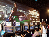 EAブースで今回最も気合の入った出展作品が,この「ニード・フォー・スピード アンダーグラウンド2」だろう。アーケードのように,シートとホイールがズラリと並んだプレイコーナーが用意され,フリーランのスタイルによって生まれ変わったNFS:UG2を体験できる。ただし展示されていたのはPS2版なので,PCゲーマーの胸にはなぜかちょっぴり寂しい思いが込み上げてくる。秋だし。 "フリーラン"とは,走行の舞台として街一つが用意されており,基本的に街中を好きなように流せる仕組み。街ではライバルカーも走っており,接近して合図を送ると"アウトラン"という1対1のバトルが始まる。ライバルカーはバトルが始まった途端に猛スピードですっ飛んで行ってしまい,ちょっとズルいと思った。 また,街にはさまざまなショップやイベント発生ポイントなどもある。ストリートレースを開催している場所や,なぜか写真撮影ポイントもあり,"依頼"を受けられるポイントにも遭遇した。なんとなく「グランドセフトオート3」を思い出す人も多いかもしれない。 ちなみに一番の見どころは,やはりどどーんと展示してあるガルのセリカ。ここでは時間によってコンパニオンのお姉さん達(ワイルドスピードで見たような素敵なファッション)が登場し,セクシーなパフォーマンスを披露していた。次回作では,ゲームにもぜひ同様の要素を取り入れてほしい。