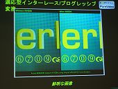 ●プログレッシブ変換 テレビ画像は1画面を奇数ラインで下まで描いて,偶数ラインを下から描いて1画面を構成している。それぞれ1/60秒単位で表示されているわけだが(インタレース表示),この画像をPCなどのノンインタレース表示のディスプレイで静止させると,当然ながら奇数ラインと偶数ラインで画像のブレが発生してしまう。これを処理するのがプログレッシブ変換だ。