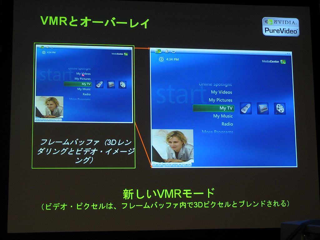 処理の中枢はGeForce6シリーズGPUに組み込まれたユニットで,プログラム可能な16ウェイのベクトルプロセッサと動き予測エンジン,高画質デジタルビデオデコーダの三つの部分で構成されている。NVIDIAによれば,業界唯一のプログラム可能なビデオ専用プロセッサだそうだ(過去にMpactプロセッサとかもあったのだが)。 ビデオプロセッサ部分はマイクロコード,GPU部分はShaderプログラム,さらにCPUプログラムの3種共同で行われるマイクロコード部分を書き換えることで,今後登場するCODECにも柔軟に対応できるなどの特徴がある。 ソフトウェア技術的には,マイクロソフトのVideo Mixing Renderingを業界で初めて採用しており,フレームバッファ上に直接ビデオレンダリングを行うため,従来のビデオオーバーレイベースのビデオアーキテクチャよりも柔軟な表示が可能になる。現状ではプレイヤーが対応していないようだが,複数のビデオストリームを同時に再生することも可能だ。