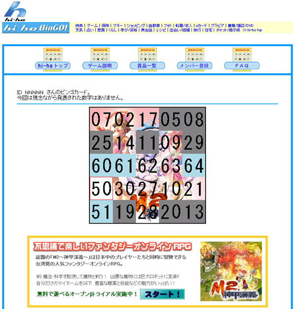 hi-ho BinGO!は,hi-hoのゲームコンテンツの一つで,配布される数字を5×5のビンゴカードに埋めていき,縦,横,斜めのいずれか一列をそろえるというパーティーゲーム。hi-hoビンゴ featuring M2〜神甲演義〜では,配られるカードの背景が,M2〜神甲演義〜のイメージイラストとなっているというもの。利用料金は無料となっているが,遊ぶためにはガイアックス特設サイトの「こちら」で新規にIDを登録する必要がある。