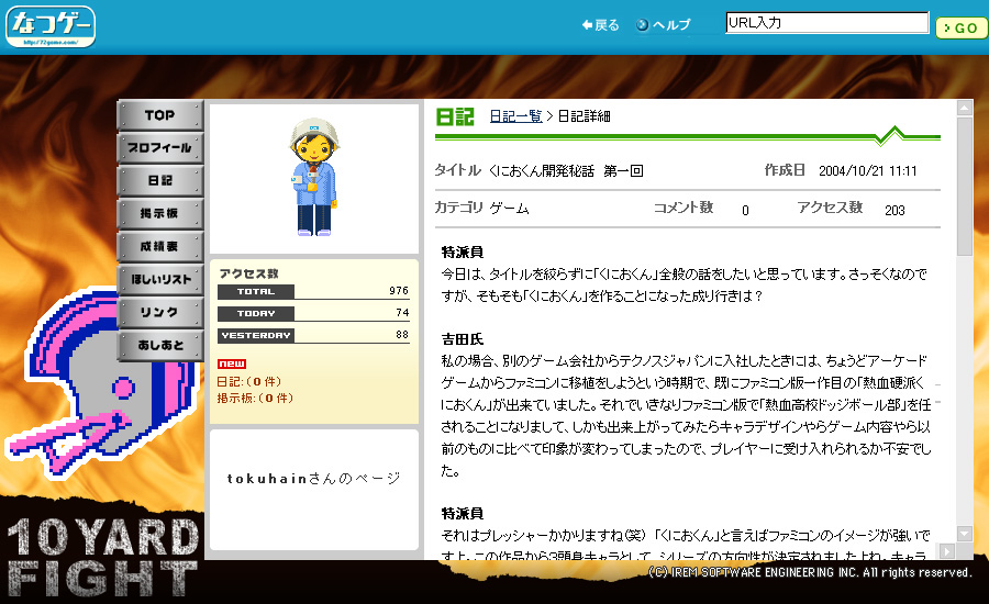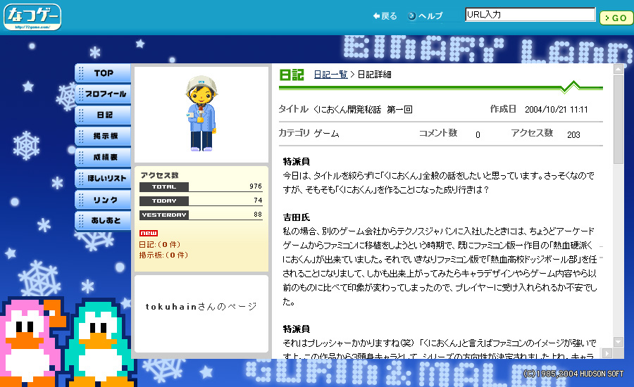また本日,なつゲー会員が利用できるマイホームページに,「バイナリィランド」と「10ヤードファイト」のスキンが追加された。バイナリィランドスキンでは主人公のペンギン「グリン」と「マロン」の可愛らしい2ショットが,10ヤードファイトスキンではアメリカン・フットボールらしいヘルメットがマイページ上に表示される。