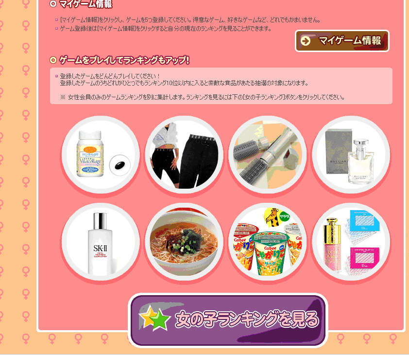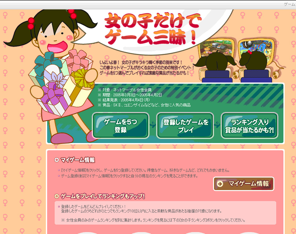 イベント内容だが,対象である女性会員(既存/新規を問わず)は,まずネットマーブルで遊べる大量のゲームの中から好きな5種類を選んで登録する。登録されたゲームの成績ランキングは「マイゲーム情報」で表示され,このランキング上位者の中から抽選で,SK-II化粧品やコエンザイム配合サプリメントなど女性に人気の賞品が贈られる。 実施期間は3月3日(水)18時 〜 4月2日(土)18時で,成績発表は4月4日の予定。