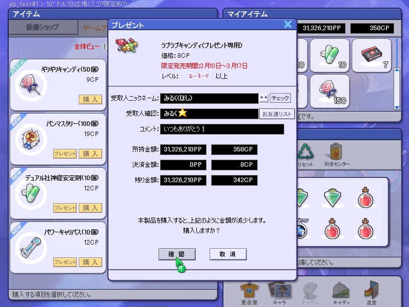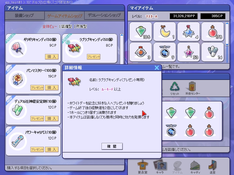 具体的には「ラブラブキャンディ」(経験値2倍),「ギリギリキャンディ」(経験値2倍※)という経験値ボーナス付きのキャンディが販売され,さらに対戦プレイ時にはドロップアイテムとして「ドロップキャンディ」(PP:Pang Point 1.2倍)が入手できる。これらキャンディを所持してラウンドするだけで,それぞれの効果が発揮される仕組みだ。