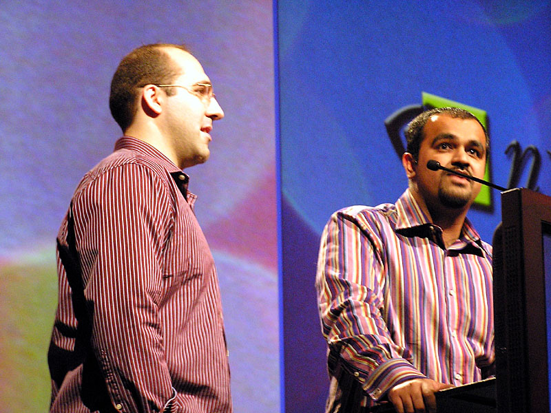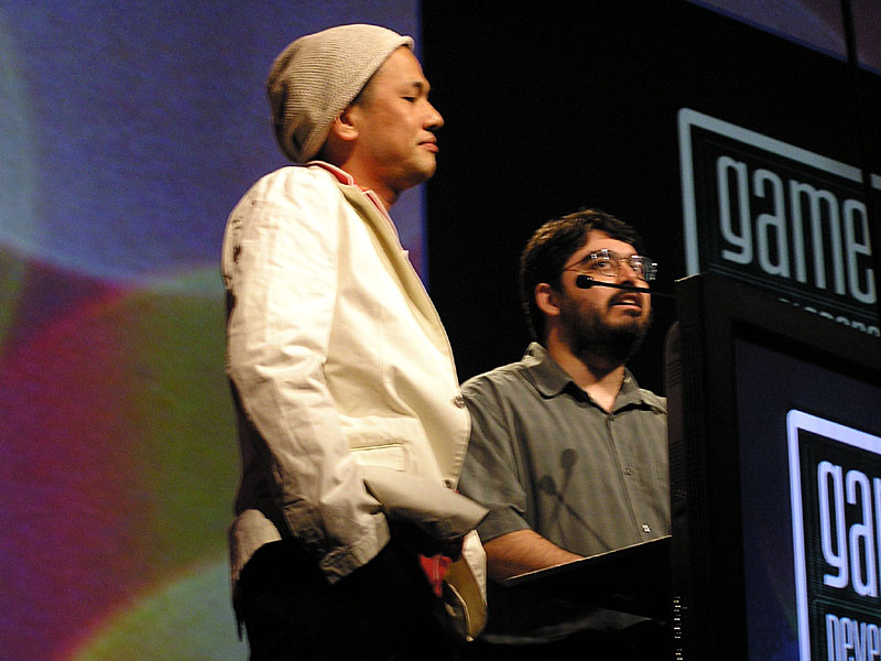 ナムコの「塊魂」(米国では「Katamari Damacy」)は,5部門のノミネートのうちイノベーション賞とゲームデザイン賞の二つだけに留まったが,会場内の歓声が最も多かったことからも,米国の開発者達の評価が非常に高かったのが分かる。当日に到着したばかりの高橋慶太氏は,イノベーション賞のときに「時差ボケで眠たいです。でもありがとう」とコメント。さらにゲームデザイン賞の受賞では「だいぶ頭が回転してきました。ありがとう」と短いながらもユニークな話しぶりで会場を沸かせていた。