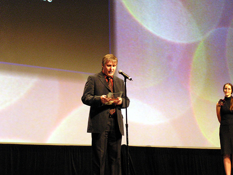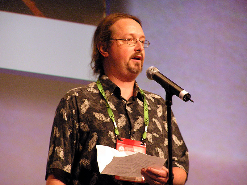 写真右:脚本賞の受賞コメントとして,ライターらしく几帳面に書かれたメモを読み上げるValve Software社のマーク・レイドロー(Marc Raidlaw)氏
