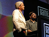 ゲーム産業のアウトローに贈られる「マーベリック賞」を受賞したのは,イギリスのメディアアーティスト3人組。劇場の観衆たちが携帯電話を持ち,街でリアルタイムに行動する役者とチャットで意思疎通しながらストーリーを進めていくという,「Uncle Roy All Around You!」などのパフォーマンスが,ゲーム的ながらも既存の枠組を越えた活動として認められたようだ。 「コミュニティ貢献賞」は,IGDAで13年前から「ゲームと女性」という問題に関ってきたシェリー・グラナー・レイ(Sheri Graner Ray)氏が受賞している。最近ではSony Online Entertainment社で「Star Wars Galaxies」のキャラクターデザインなども手がけている氏だが,「Gender Inclusive Game Design Expanding the Market」(女性も考慮したゲームデザインは市場を拡大させつつある)と題した論文を上梓するなど,現在も精力的に活動しているのが評価された。