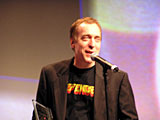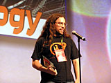 また,「ライフタイムアチーブメント賞」に選ばれたのは,ユージーン・ジャーヴィス(Eugene Jarvis)氏である。彼は,6万台のアーケード機,700万本のAtari 2600ソフトという記録的なヒットを飛ばした「ディフェンダー」(1980年)を皮切りに,「Robotron 2084」(1982年)や「Smash TV」(1991年),「Crusin’USA」(1994年)などのデザイナーとして知られている。 彼の作品には,とにかく倒すべき敵がワラワラと登場するようなアクションゲームが多く,とくにRobotronは今でも多くの開発者のトラウマとなっているらしい。まるで「DOOM」のご先祖様のようなソフトだが,ジャーヴィス氏自身はRaw Thrills社を起業して現在でも第一線で活躍しており,緊張の面持ちながらもにこやかで優しそうな風貌が印象的だった。(奥谷海人)