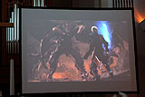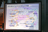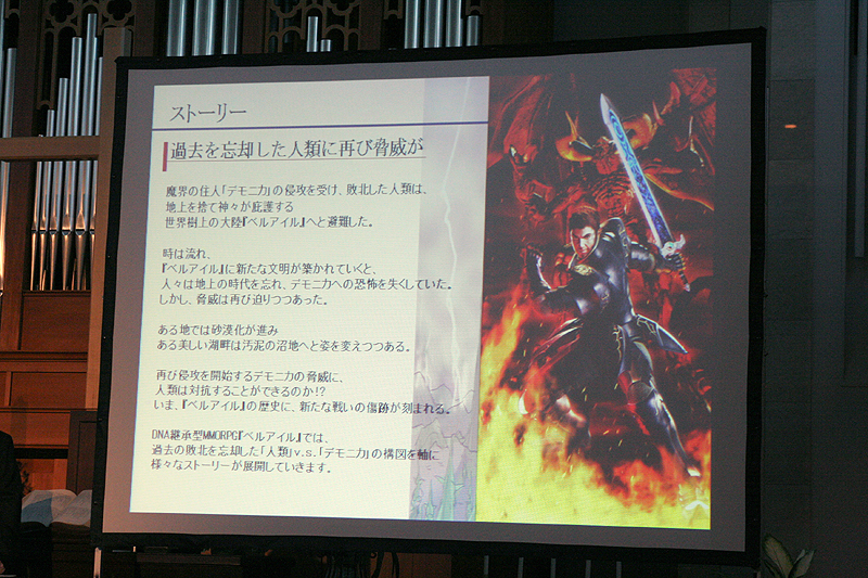 さて,その次にはベルアイルの開発を行うヘッドロックのディレクター津屋圭吾氏が壇上に立ち,ゲームシステムの詳細を語った。自分のタイミングで攻撃できる戦闘システムや,呪文をキータイプすると素早く詠唱が終わる魔法詠唱システムなど,本作がプレイヤースキルも重視していることに話の焦点が当てられていたのが印象的だった。 キャラクターは年齢を重ねることで外見が変わり,その段階数は7(乳児,幼児……など)。最終的にキャラクターは老人となるが,老齢でキャラクターが使えなくなるということはない。子供(必ず双子。相方のプレイヤーも持てるわけだ)をもうけて能力引き継ぎを行うと,"キャラクターとして"使えなくなるとのことだ。 また,本作の特徴の一つである"アウトオブゲーム"は,単にログアウトしていてもキャラクターが成長するという部分に留まらず,ゲームの内外を結びつけるコンテンツとして機能するとの解説があった。具体的には,専用Webページで転送メールアドレスを登録しておくと,ゲームにログインしている/していないに関わらず,フレンドリストに登録した相手からの連絡が(携帯メールかインターネットメールで)届くそうだ。 ここ数年,オンラインゲームには常にプレイ時間の問題がつきまとっていたが,このアウトオブゲームによって,プレイ時間を理由にコミュニティが縮まってしまうという状況にはならなそうだ。
