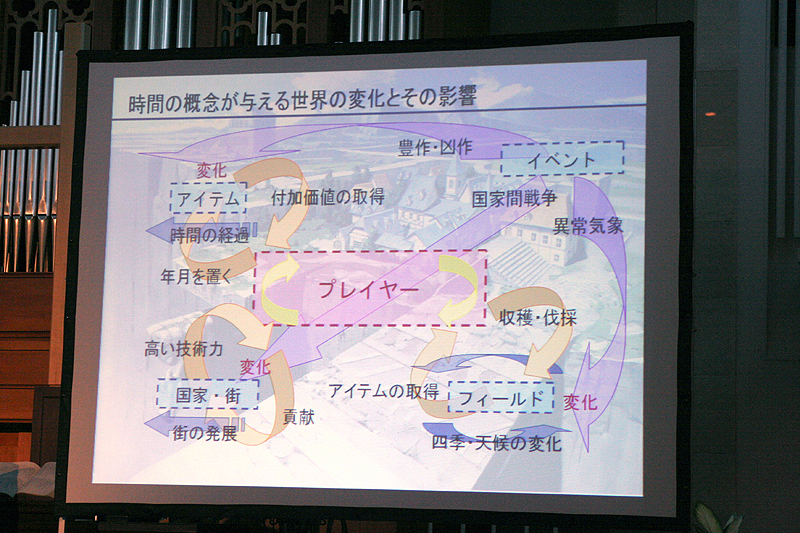 次に登壇したのは,ベルアイルのプランナーを務めるオーアールジーの中澤光博氏。本作の世界設定やすべての事象が時間によってサイクルしているというコンセプト部分を解説し,4月27日からの正式サービス後も,多くの新要素の導入を予定していると語った。 新要素の具体的な内容は語られなかったが,予定されている実装順としては,結婚システム,セクト,新ダンジョンとなるらしい。これらのうち,結婚システムは本作のユニークな部分であり,ゲームシステムのコア部分となる"世代交代"を実現するには必要不可欠なので,早期の実装を期待したいところだ。